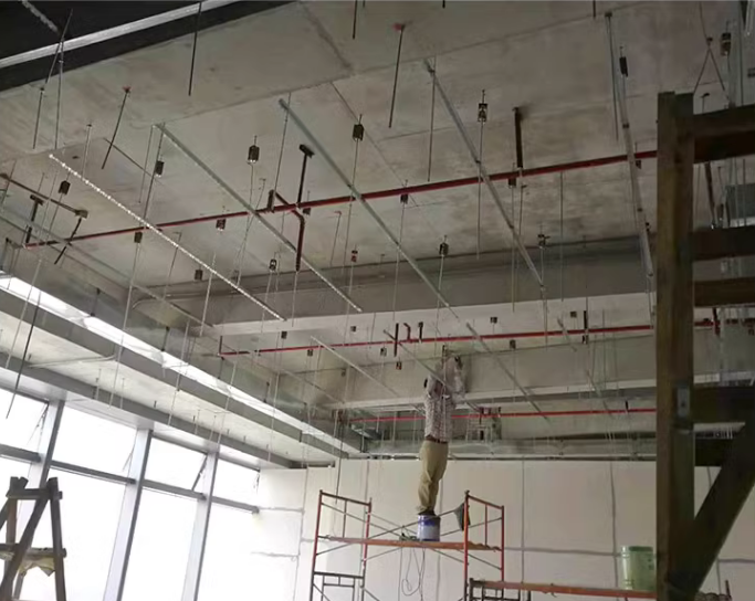 2、將吊頂減震器安裝在連接頂面和輕鋼龍骨之間;